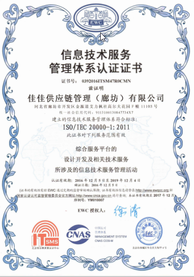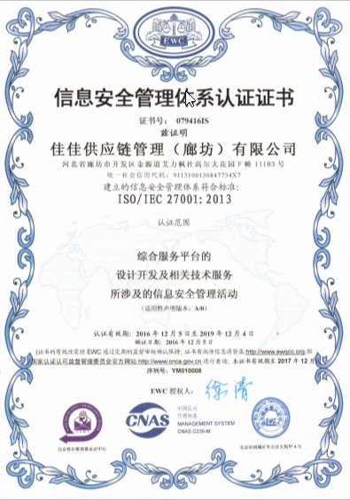 經(jīng)過(guò)我公司指導(dǎo),佳佳供應(yīng)鏈管理(廊坊)有限公司順利取得ISO27001信息安全管理體系、ISO20000信息技術(shù)服務(wù)管理體系認(rèn)證證書(shū)。