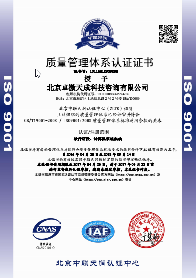 經(jīng)過我公司指導(dǎo),北京卓微天成科技咨詢有限公司順利取得ISO9001質(zhì)量管理體系認(rèn)證證書。