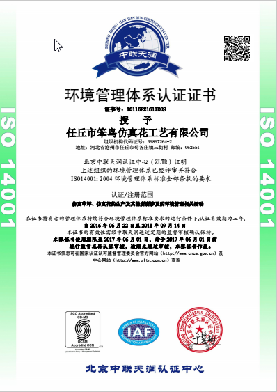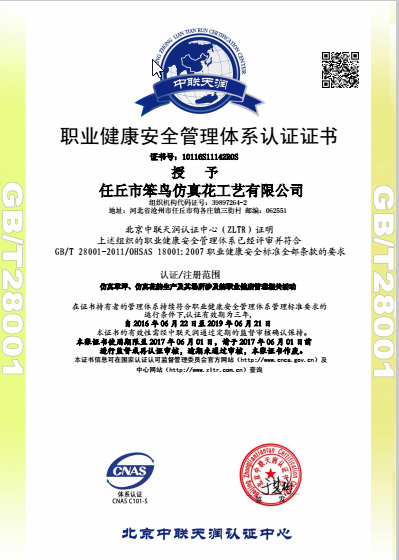 經(jīng)過我公司指導(dǎo),任丘市笨鳥仿真花工藝有限公司順利取得ISO9001質(zhì)量管理體系、ISO14001環(huán)境管理體系、OHSAS18001職業(yè)健康安全管理體系認(rèn)證證書。