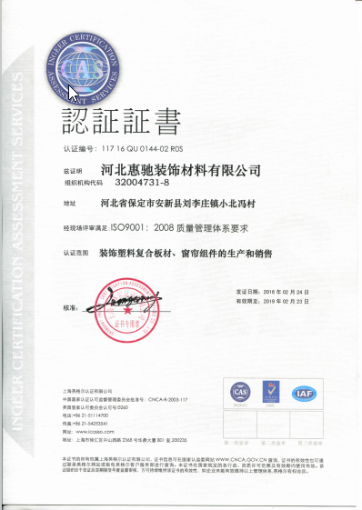 經(jīng)過我公司指導(dǎo),河北惠馳裝飾材料有限公司順利取得ISO9001質(zhì)量管理體系認(rèn)證證書。