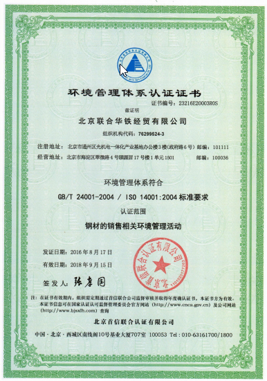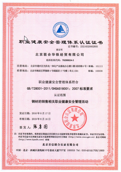 經(jīng)過(guò)我公司指導(dǎo),北京聯(lián)合華鐵經(jīng)貿(mào)有限公司順利取得ISO9001質(zhì)量管理體系、ISO14001環(huán)境管理體系、OHSAS18001職業(yè)健康安全管理體系認(rèn)證證書。