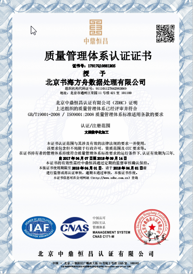 經(jīng)過(guò)我公司指導(dǎo),北京書(shū)海方舟數(shù)據(jù)處理有限公司順利取得ISO9001質(zhì)量管理體系認(rèn)證證書(shū)。