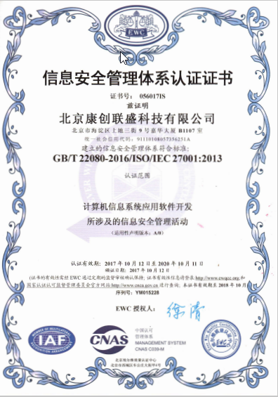 經(jīng)過我公司指導(dǎo),北京康創(chuàng)聯(lián)盛科技有限公司順利取得ISO27001信息安全管理體系認證證書。